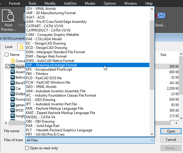 You can also browse to folders containing drawings you want to open or open a Template by clicking on the drop-down menu at the top left corner of the dialogue box and selecting the desired template. You can also use this window to import files of other types by changing the option in "File of type" and selecting the file type you want to open from a drop-down list. Opening New File: If you want to create a new drawing, click New.