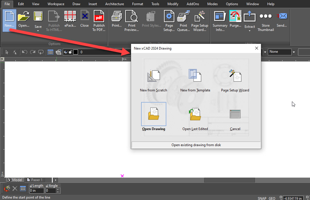 You can also close this window by clicking Cancel. You can then select File/New within xCAD to create a new drawing.