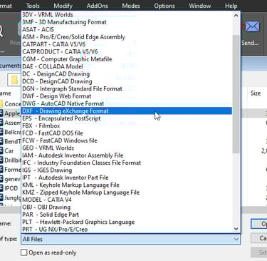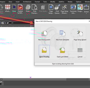 Open Drawing: Opens an existing drawing. Browse to the desired folder to locate the file. For acceptable file types,