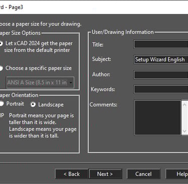 If you selected Page Setup Wizard in the New xCAD Drawing window, the wizard opens automatically. You can also access it via File/Page Setup Wizard. In the first page you can choose between English and Metric units.