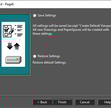 The sixth and final page enables you to save the settings for future drawing or to restore the initial settings. Settings can be edited in the xCAD Explorer Palette .